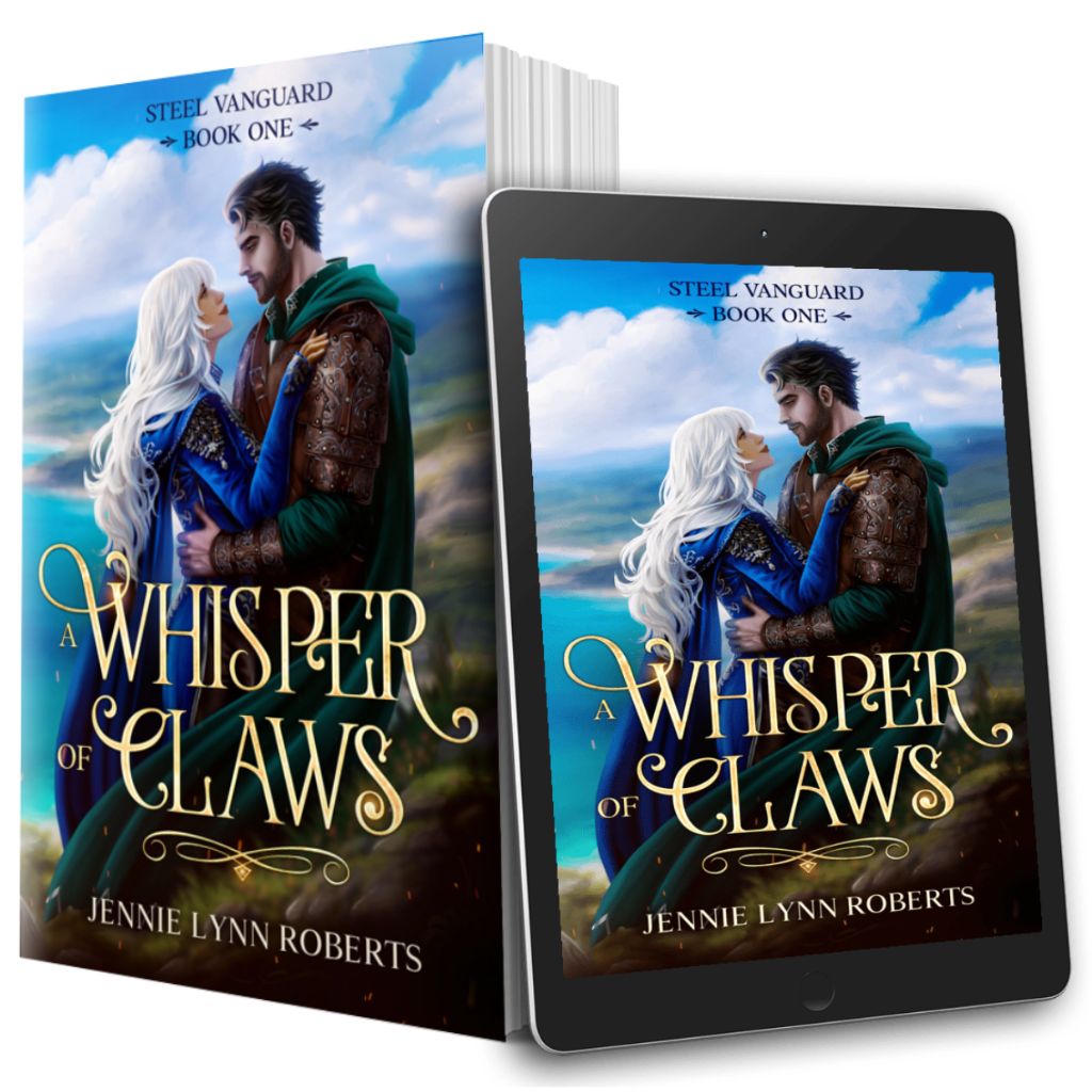 A Whisper of Claws (book 1 of The Steel Vanguard) is a steamy dragon shifter romance with tons of action. Expect chosen mates, forced proximity, off-limits (he thinks so anyway), found family, second chance, protective hero, fierce heroine, court intrigue, inner beasts with sharp claws and sharper attitudes… and a hard-won happily ever after.